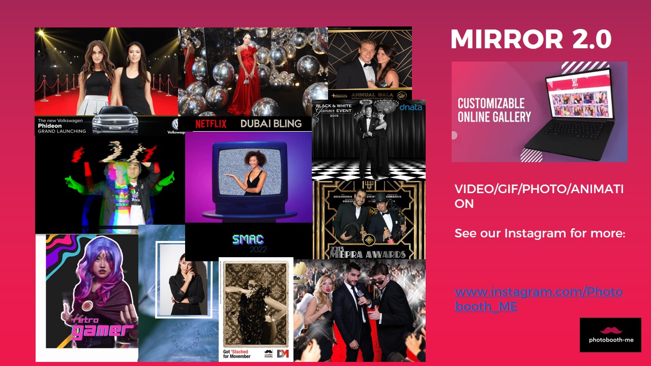 AI Photobooths, Premium Style Mirror Booths Dubai, 360 Photobooths, Augmented Reality, AI Backgrounds, Videobooths, Catwalk Booths, Tuktuk photobooth, Greenscreen, Enclosed Photobooth, Roving Photobooth, Kaleidoscope Photobooth; Mosaic photobooth, Red Carpet photobooths, Awards photobooths and more...Talk to the team on bookings@photobooth-me.com about your next event